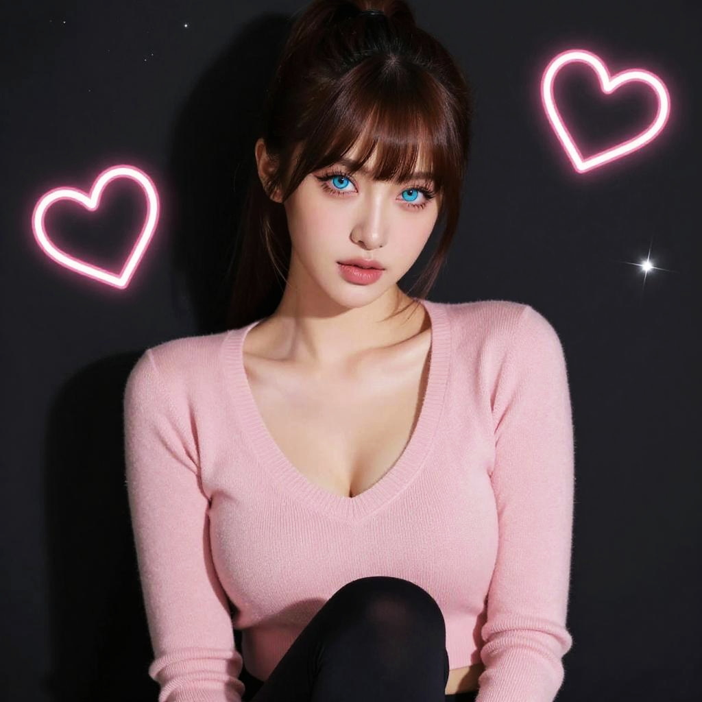 Score_9, score_8_up, score_7_up, score_6_up, score_5_up, score_4_up, portrait of a glamorous woman, sultry, swept bangs, brown ponytail, pink sweater, black shirt, cleavage, black yoga pants, heterochromia, starry dark moonlit background, with shiny neon hearts, up close, dark shadows, realistic, long eyelashes