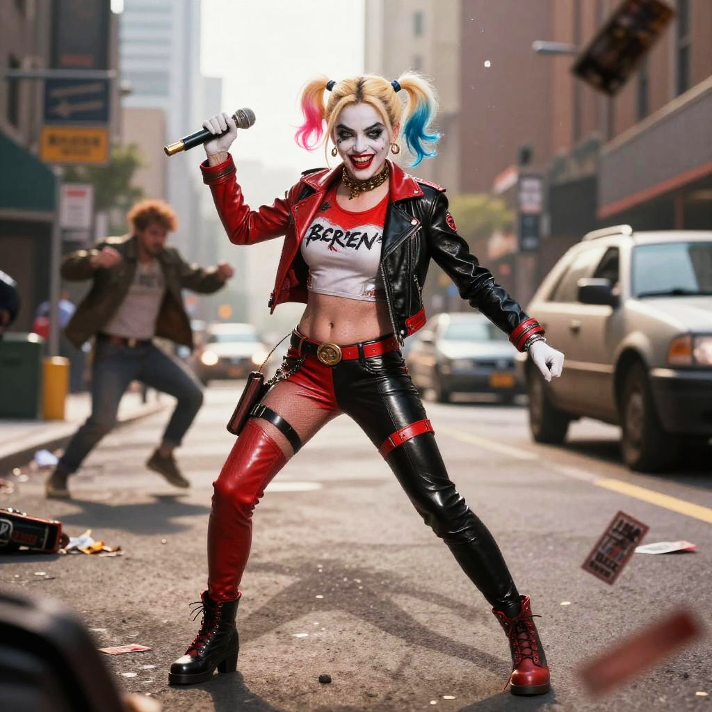 Harley Quinn leather costume with red and black details, action-packed scene, chaotic city street, high energy, stylized comic art, vivid shadows