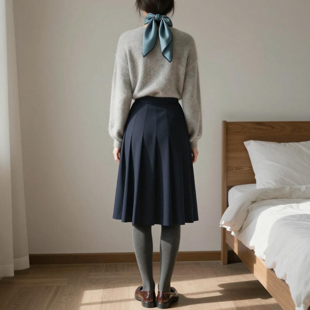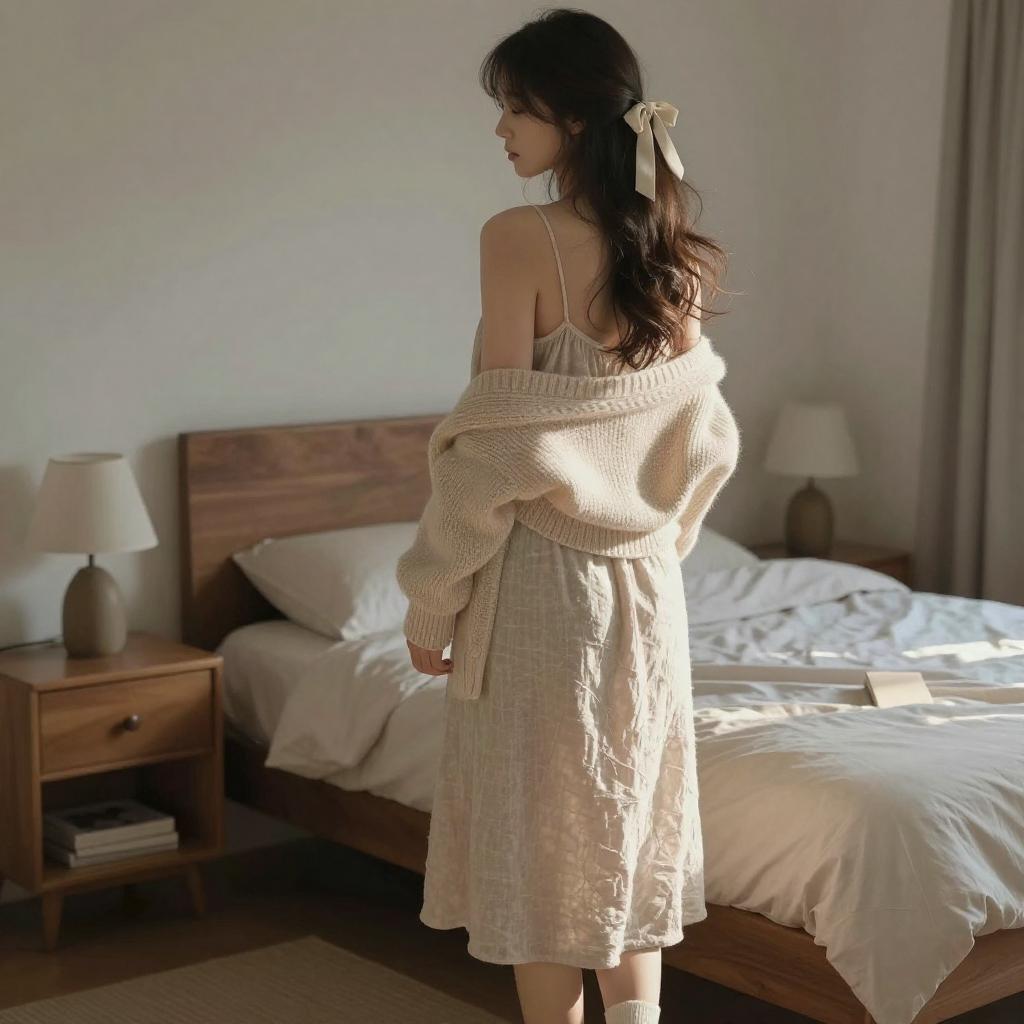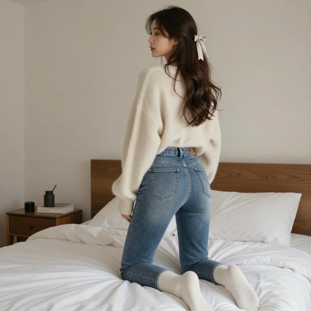 (masterpiece:1.2), (best quality:1.2), (extremely detailed:1.2), (photorealistic:1.2), (ultra-detailed:1.2), (illustration:1.0), (anime style), (ulzzang-6500-v1.1:0.8), ass up wait, cozy oversized sweater, high-waisted jeans, knee-high socks, simple hair ribbon, slim figure, toned back, athletic legs, natural posture, 1girl, in the bedroom, view from behind