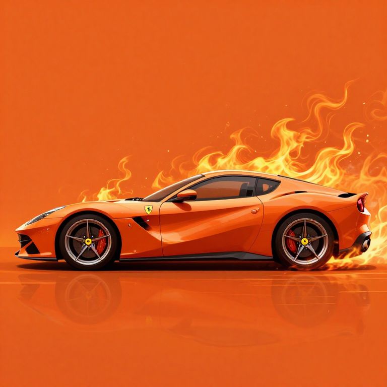 A vibrant digital illustration of a Ferrari F12 Berlinetta bathed in dramatic fiery lighting, showcasing its sleek side profile against a vivid orange backdrop, rendered in high-definition detail with abstract fire effects by El Tony.