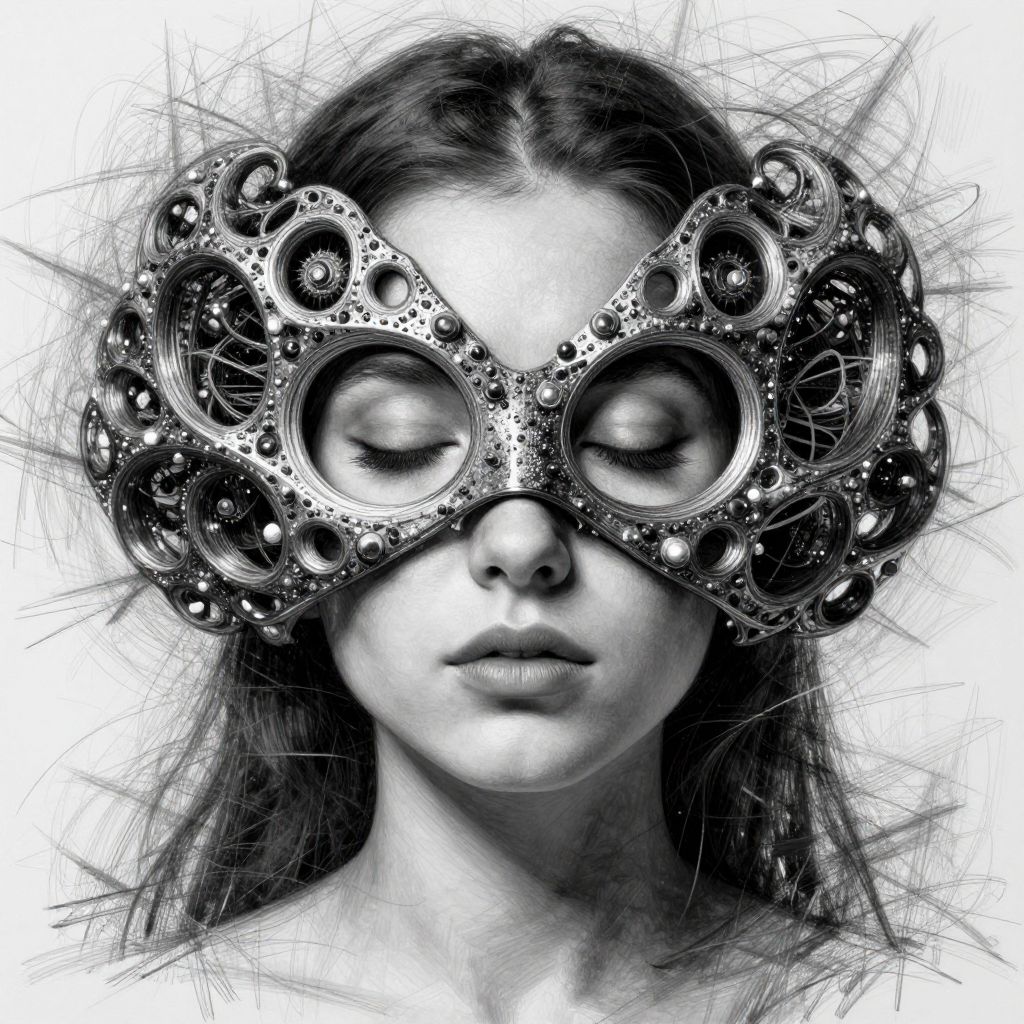 One young beautiful woman with eyes closed, with a mandelbulb mask. fractal, speed painting, scribble art, octane render, portrait. behance, artstation, black and white. intricate detail, beautiful, moody, cinematic. futurism, unreal engine, photorealistic.