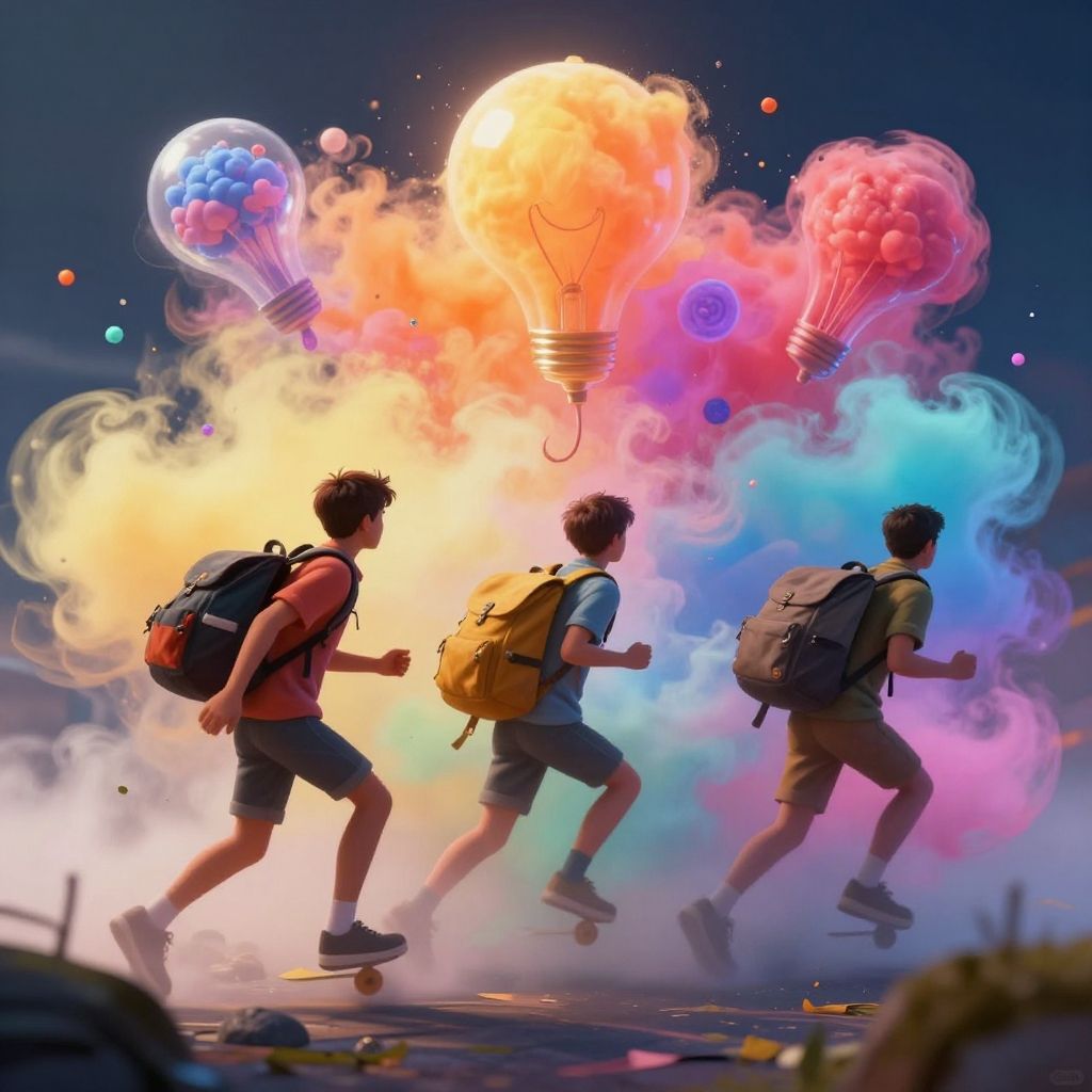 Student exploration diffusion artistic visualization, young explorers in an imaginative world where ideas and concepts diffuse like colorful fog around them, dynamic movement and vibrant hues