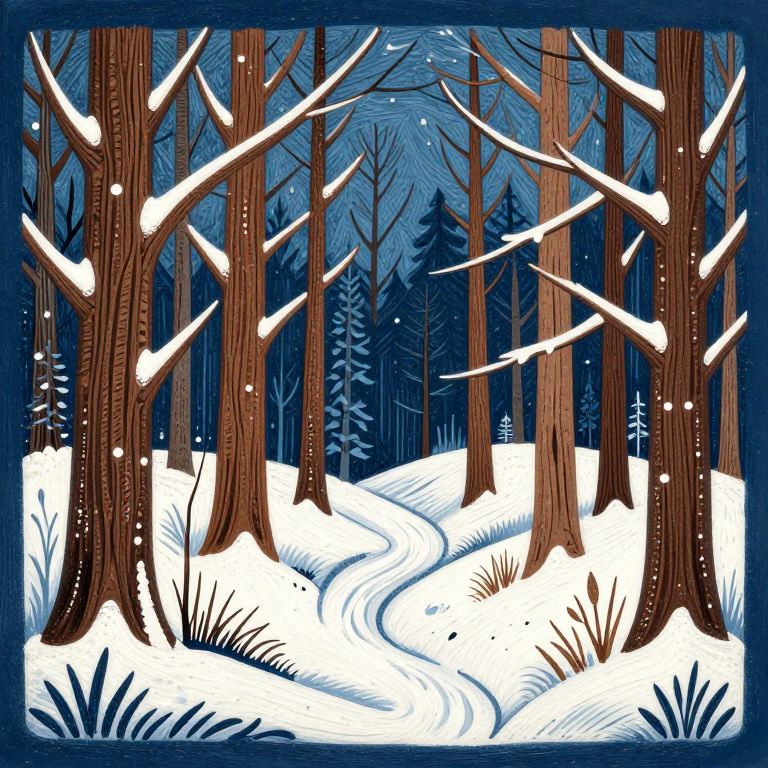 A detailed winter forest scene with snow-covered trees, depicted in a folk art style with woodcut textures.