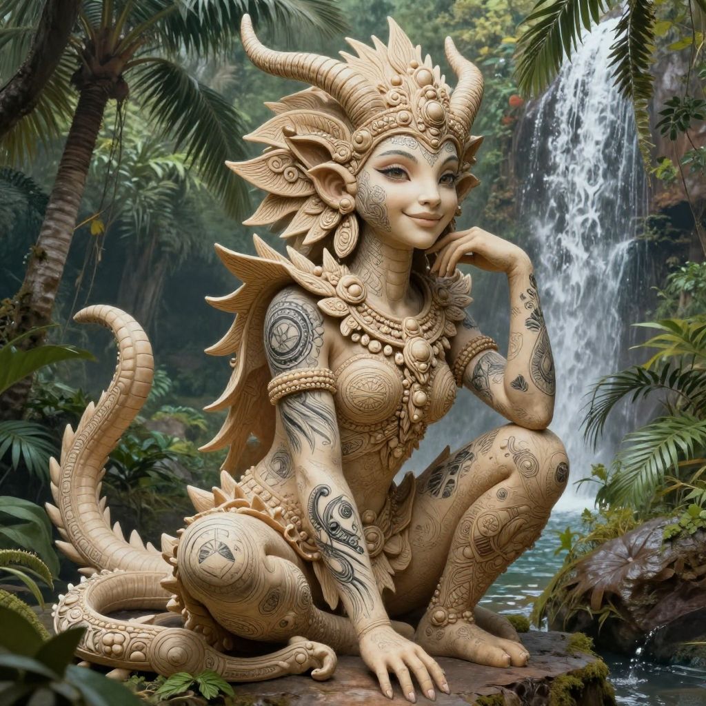 Thick dragon girl lounging in a mystical forest, her strong muscular frame covered in vibrant purple and gold scales, large wings partially spread, glowing mystical runes tattooed on her arms, serene expression, detailed fantasy illustration with soft natural light.