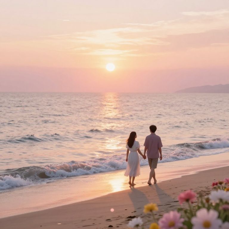 Romantic sunset beach scene with soft pastel colors, a couple holding hands walking along the shore, gentle waves, warm golden light reflecting on the water, blooming flowers nearby, dreamy atmosphere with light bokeh effects.