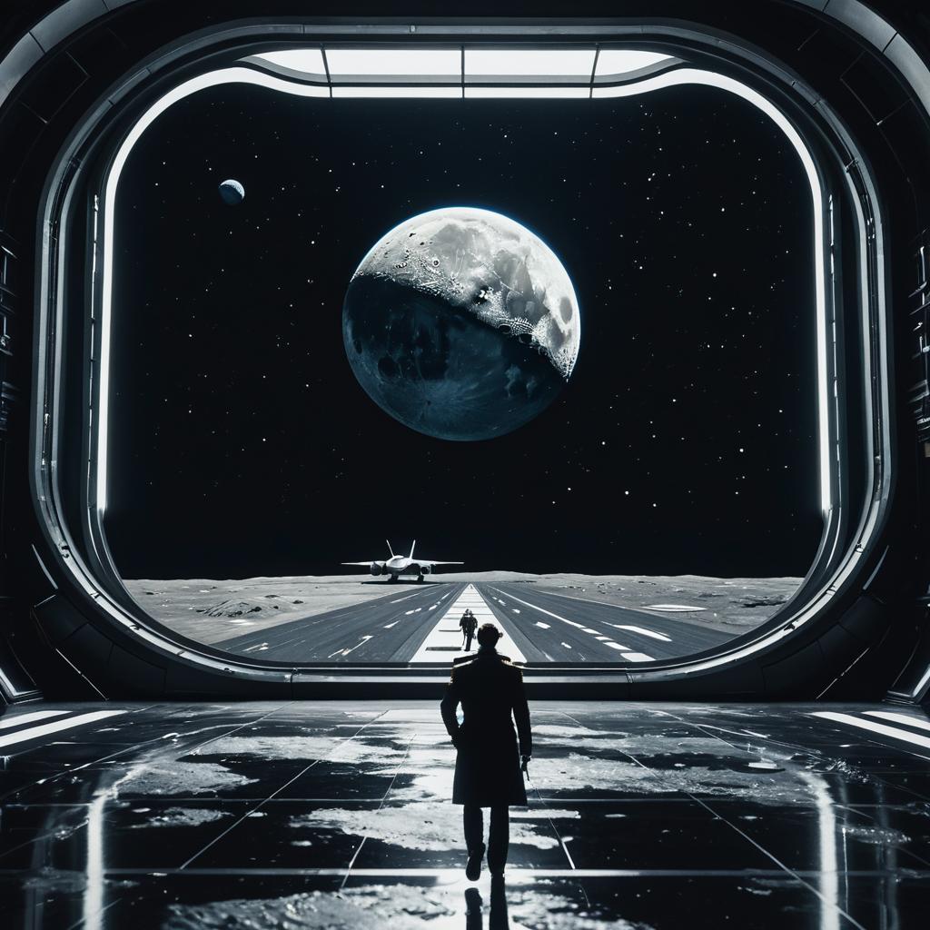 Futuristic sci-fi airport terminal on the moon with a large panoramic window showing a moon runway, a jet, and a distant astronaut. The interior features a glossy, reflective floor with artistic organic patterns, illuminated by ambient light. The scene carries a dark atmospheric vibe with high contrast and a cosmic backdrop including stars and planets. A solitary man in dark clothing walks towards the window, accentuating scale and depth.