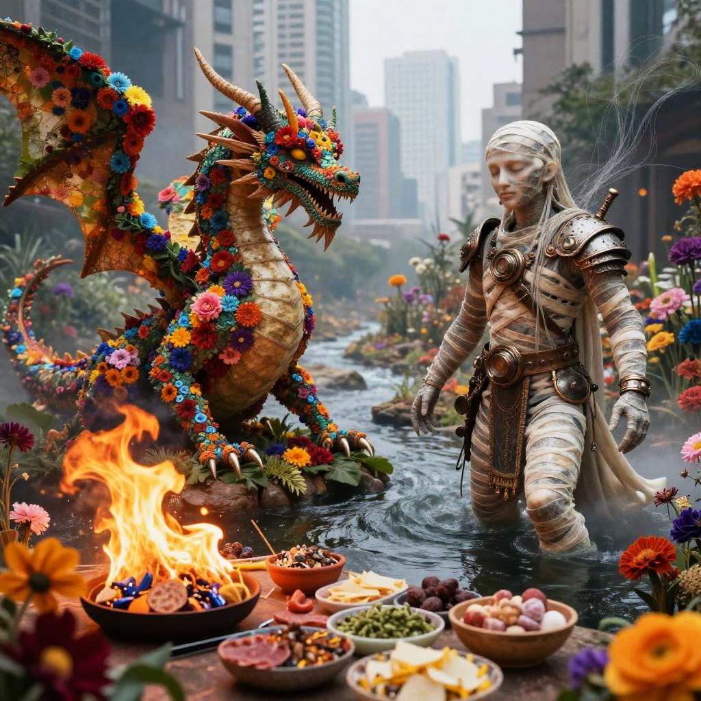 Photorealistic digital art depicting a scene in a city alley. A white-robed, muscular man with bandaged body and face, resembling a gladiator, stands waist-deep in a narrow stream. To his left, a dragon adorned with vibrant, multicolored flowers breathes a small flame. Surrounding the stream are various bowls of fruits, nuts, and flowers. The background features tall, foggy skyscrapers. The man's expression is intense, and his attire includes intricate, metallic armor. The scene is lively with bright colors contrasting the urban setting, blending fantasy elements with urban life.