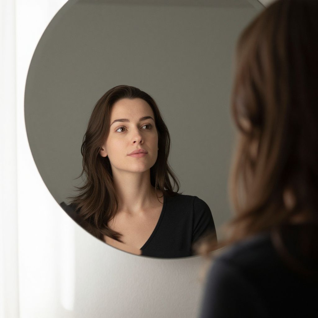 Photograph of a Caucasian woman with fair skin and dark brown, shoulder-length hair, standing in front of a round mirror. She wears a black V-neck shirt and gazes slightly upward with a neutral expression. The background is a plain gray, creating a minimalist setting. The mirror's white frame contrasts sharply with her dark hair and black shirt. Her reflection is clearly visible, showing her contemplative look. The image is focused on her face and upper torso, with the mirror's circular shape framing her reflection. The lighting is soft, highlighting her facial features.