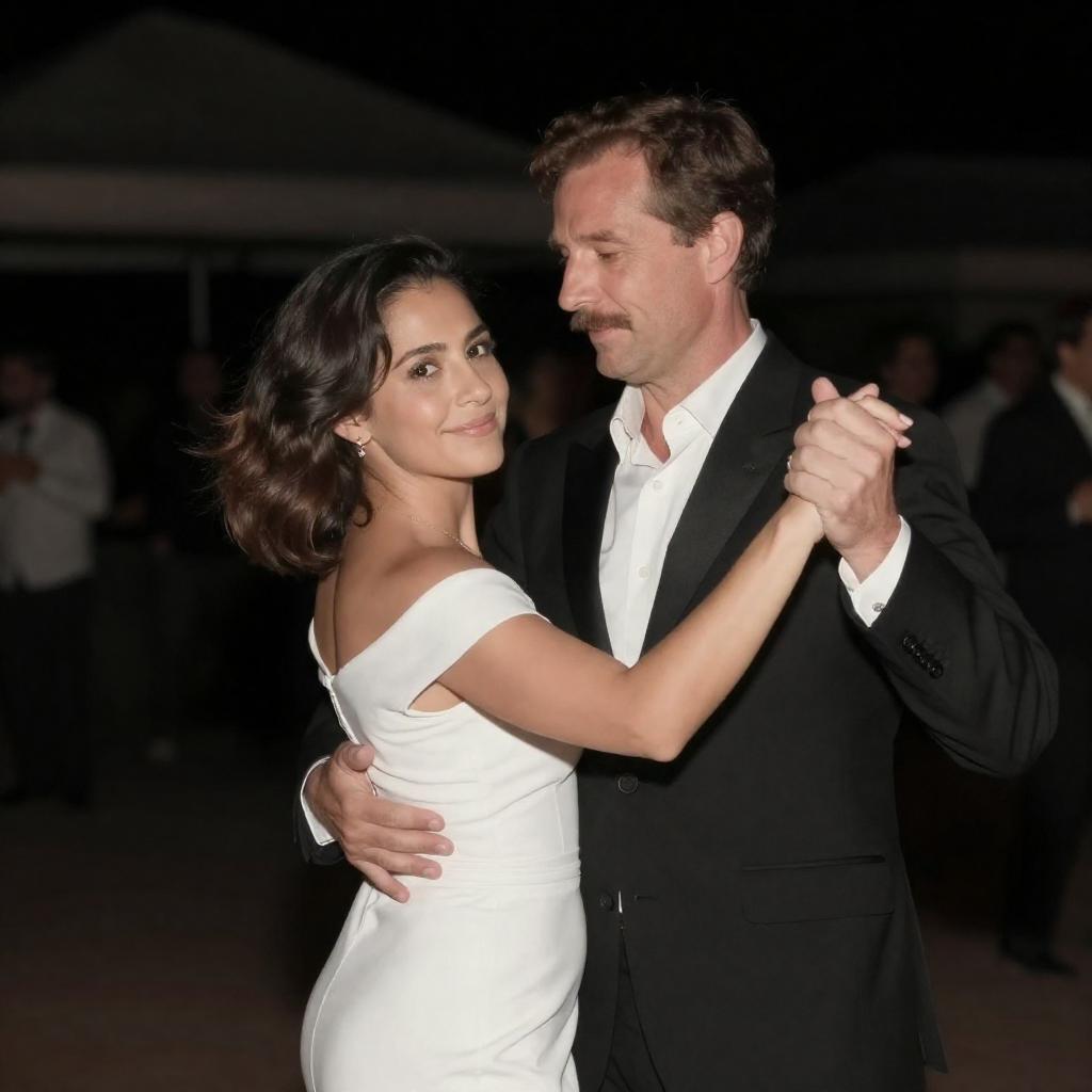 Photograph of a man and woman dancing at night. The man, with short brown hair and a mustache, wears a black suit and white shirt. The woman, with shoulder-length dark brown hair, wears a white off-shoulder dress. She smiles at the camera while looking over her shoulder. They hold hands, and the background is dimly lit with indistinct structures.