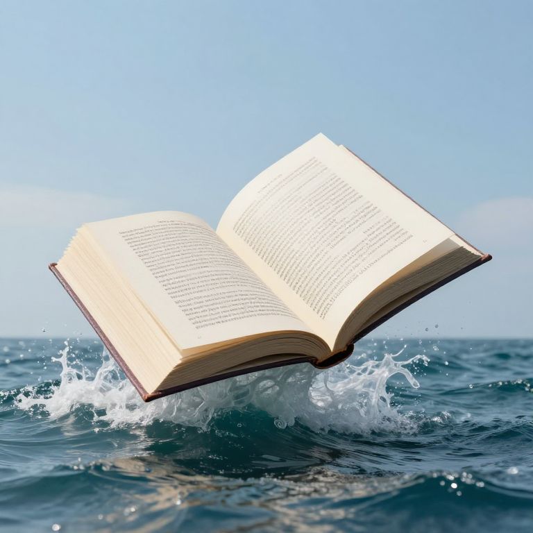 Giant, open books defy gravity as they float serenely above turbulent waves, their pages alive with undulating text that seems to merge seamlessly with the ocean below.
