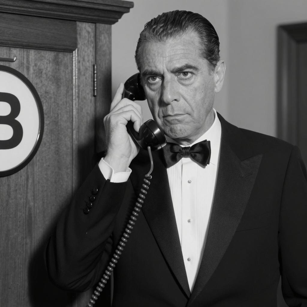 Black and white photograph of a middle-aged man in a tuxedo with a bow tie, holding a vintage rotary phone to his ear. He has slicked-back hair, a serious expression, and is standing beside a wooden cabinet with a circular and the letter "B".