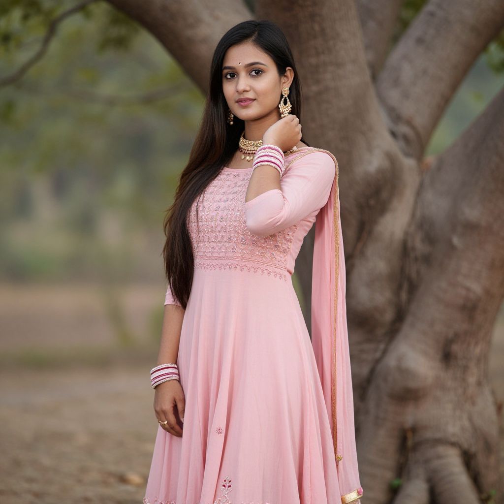 Engagement ghagra choli, 1girl, solo, dress, pink dress, long hair, jewelry, tree, bracelet, earrings, outdoors, long dress, brown hair, black hair
