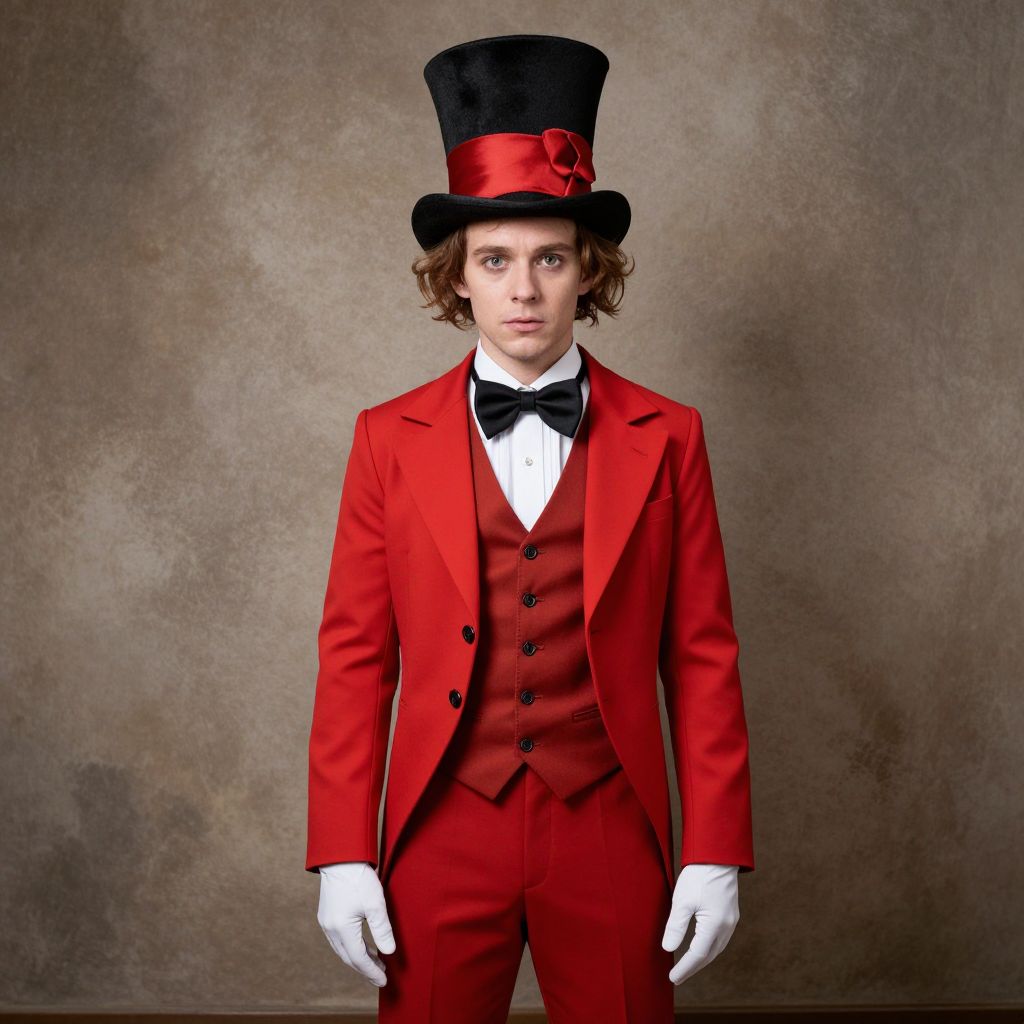 Mad Hatter Full Costume, dressed in a red suit and top hat standing in front of a wall