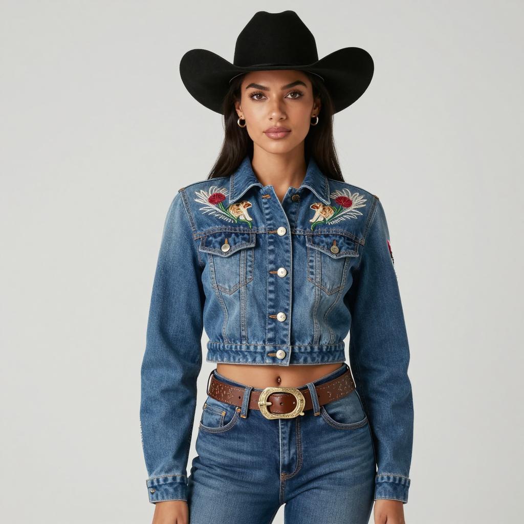 A confident woman dressed in a detailed cowgirl outfit, featuring a cropped denim jacket with embroidered patterns and matching jeans paired with a western-style belt. She completes the look with a classic black cowboy hat, exuding a modern yet authentic western vibe in this photorealistic studio portrait.