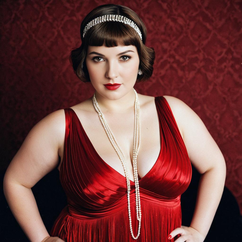 Woman red plus size flapper,1girl, solo, dress, red dress, jewelry, breasts, necklace, short hair, brown hair, hand on own hip, cleavage, makeup, looking at viewer, hairband, medium breasts, lipstick, sleeveless, red lips