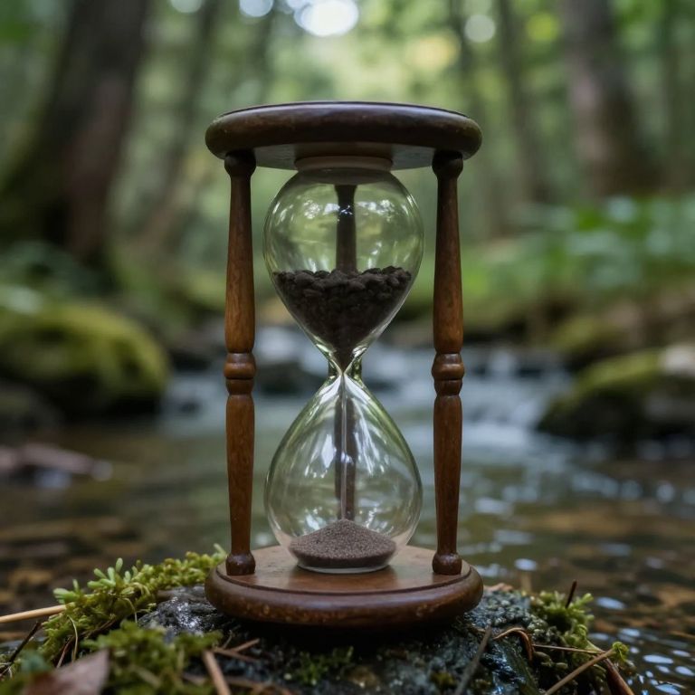Suspended between the whispers of eternity and the flow of fleeting moments, the hourglass stands as a silent sentinel in the heart of a serene forest, where the gentle hum of the stream mirrors the quiet passage of time, inviting contemplation amidst the embrace of nature’s timeless embrace.