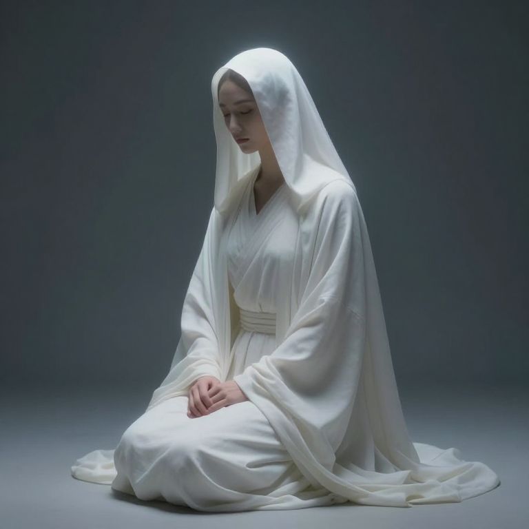 Photograph of a pale-skinned woman in a luminous, flowing white robe and veil, sitting meditatively on a dark, gradient background.