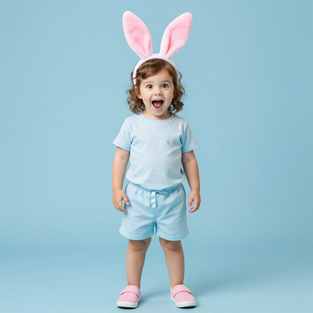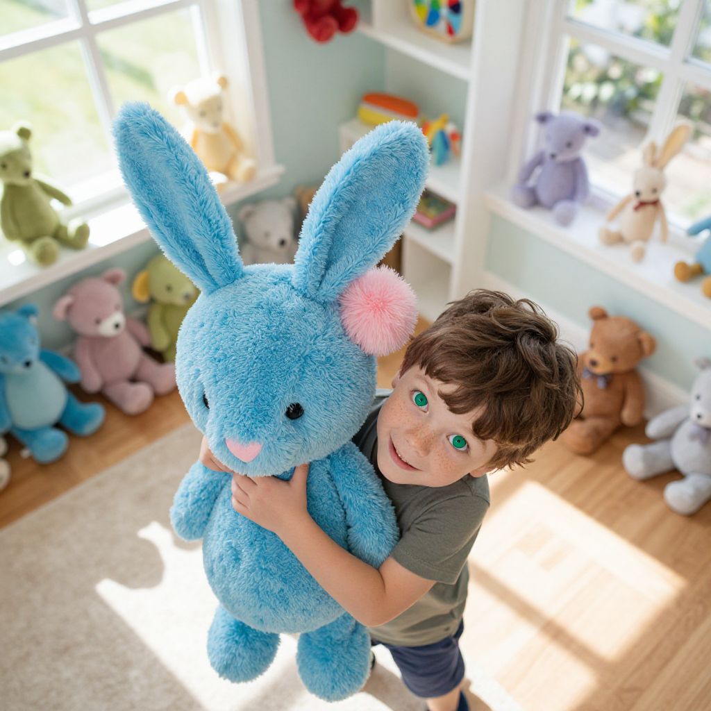 An aerial view of a child’s playroom decorated with colorful stuffed animals, where a blue plush bunny has a soft pink pompom detail on its ear, and a little boy with bright green eyes and freckles is gently hugging it, sunlight streaming through the windows