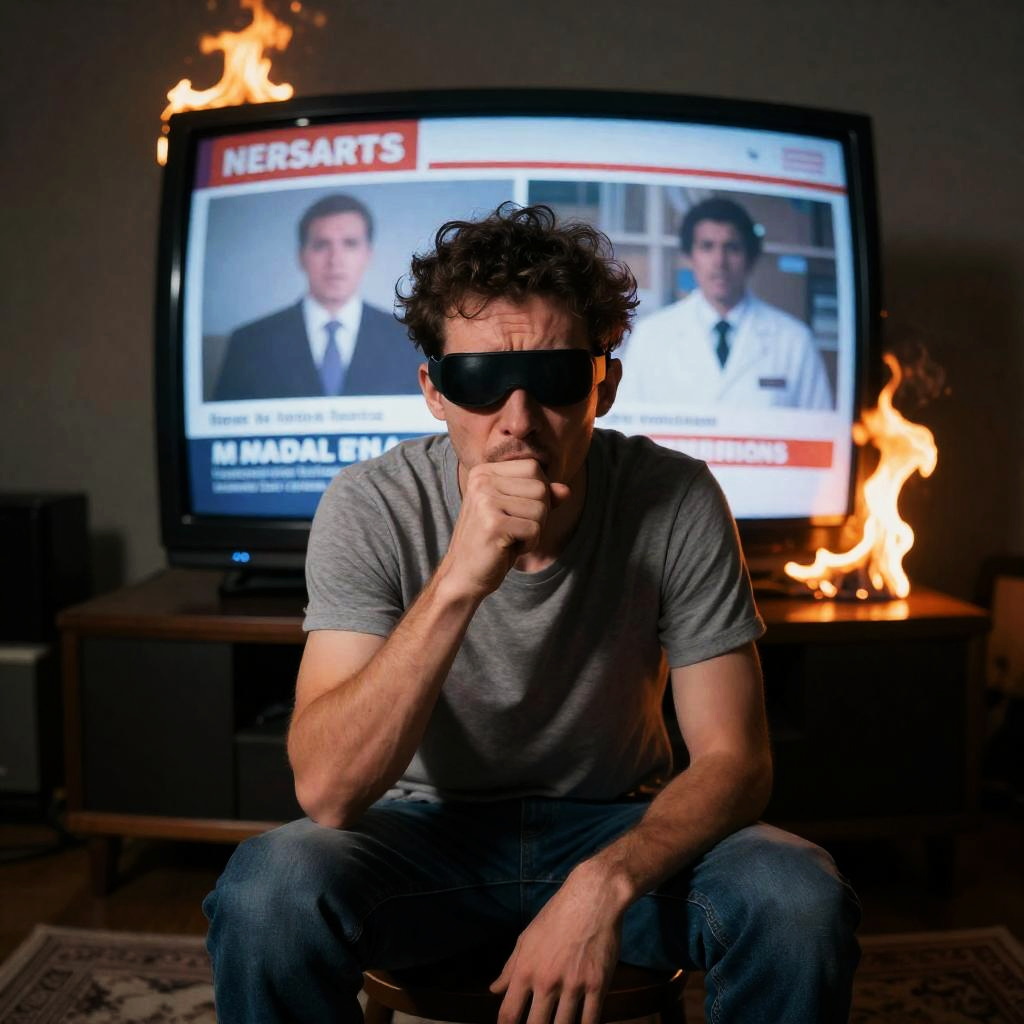 A fisheye photograph of a brainwashed man citizen in a maximalist photograph sitting with hypnotoad hypnotized eyes in a cough watching a giant TV with news on, confused, scared, dodge and burn, hyperrealistic, rugged, 32K details