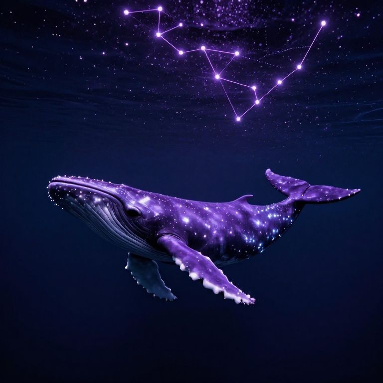 Digital artwork of a glowing, purple-hued whale swimming underwater, surrounded by a starry night sky with a constellation.