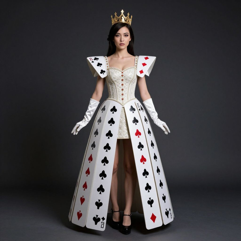 Photograph of an Asian woman with long black hair, wearing a white, puffed-sleeve dress adorned with large playing cards featuring black and red suits. The dress has a deep V-neckline, a corset-style bodice with intricate lace detailing, and a full, flowing skirt with card patterns. She also wears a gold crown and white gloves that extend to her wrists. Her black high heels are visible beneath the skirt. The background is a solid, dark gray, which contrasts with her bright white dress. Her expression is neutral, and she stands with her hands slightly out to the sides.