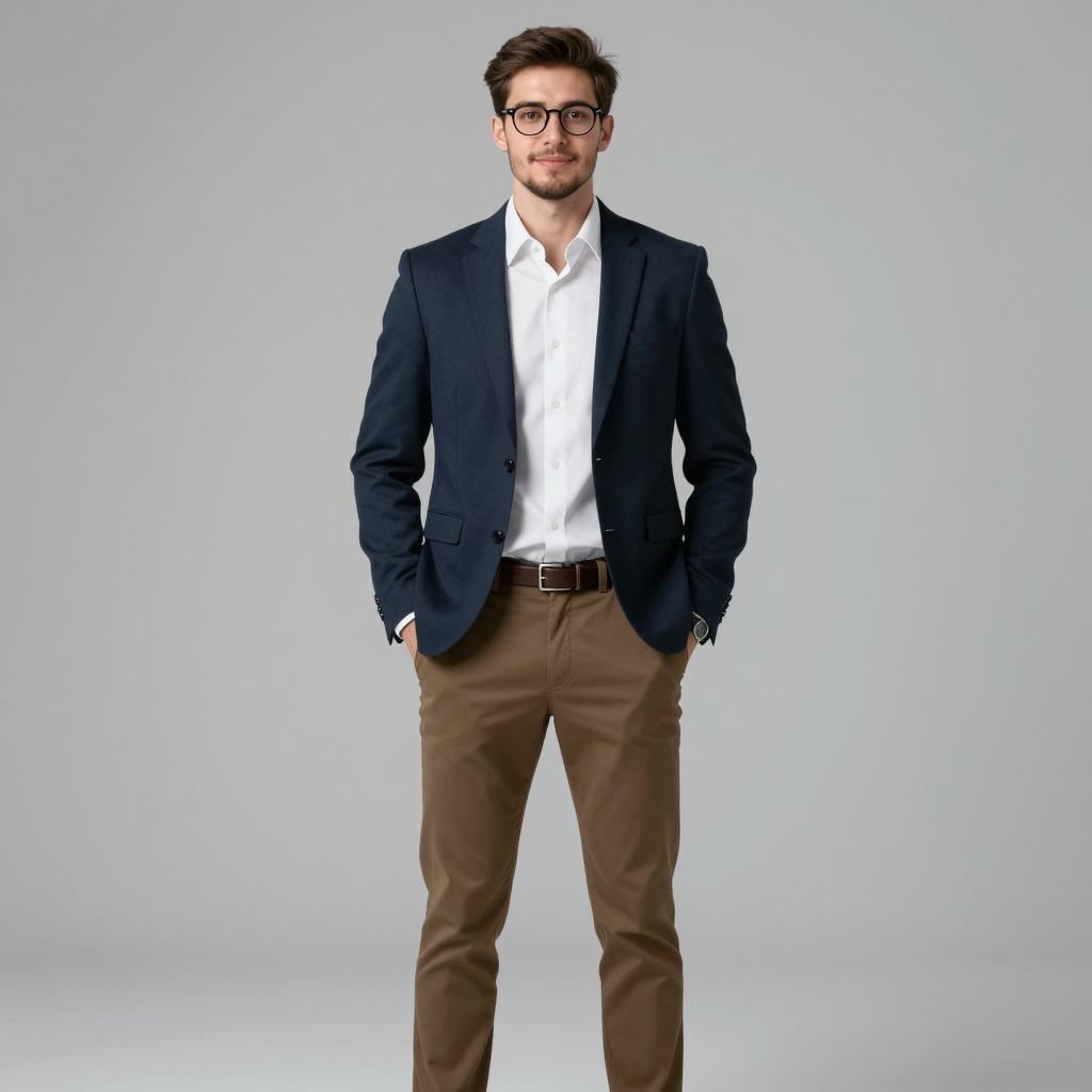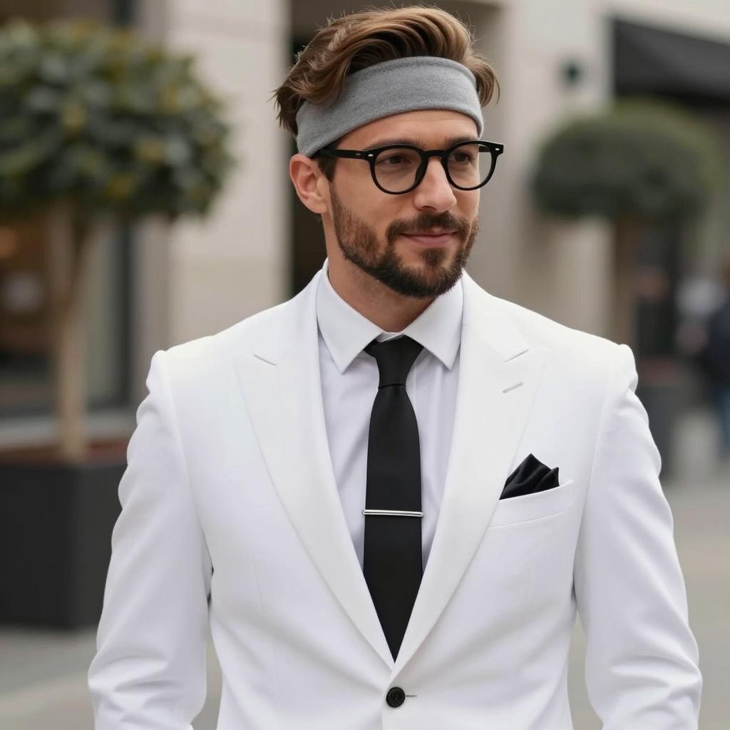 Modern gatsby attire male, photograph of a handsome man, light brown hair, short styled, wearing black-rimmed glasses, grey headband, white suit jacket, black tie, white shirt, black pocket square, standing in urban outdoor setting, potted plants in background, daytime, casual smile, well-groomed beard, upper body, realistic, modern, stylish, fashion-conscious, street style, slight blur background, soft natural lighting