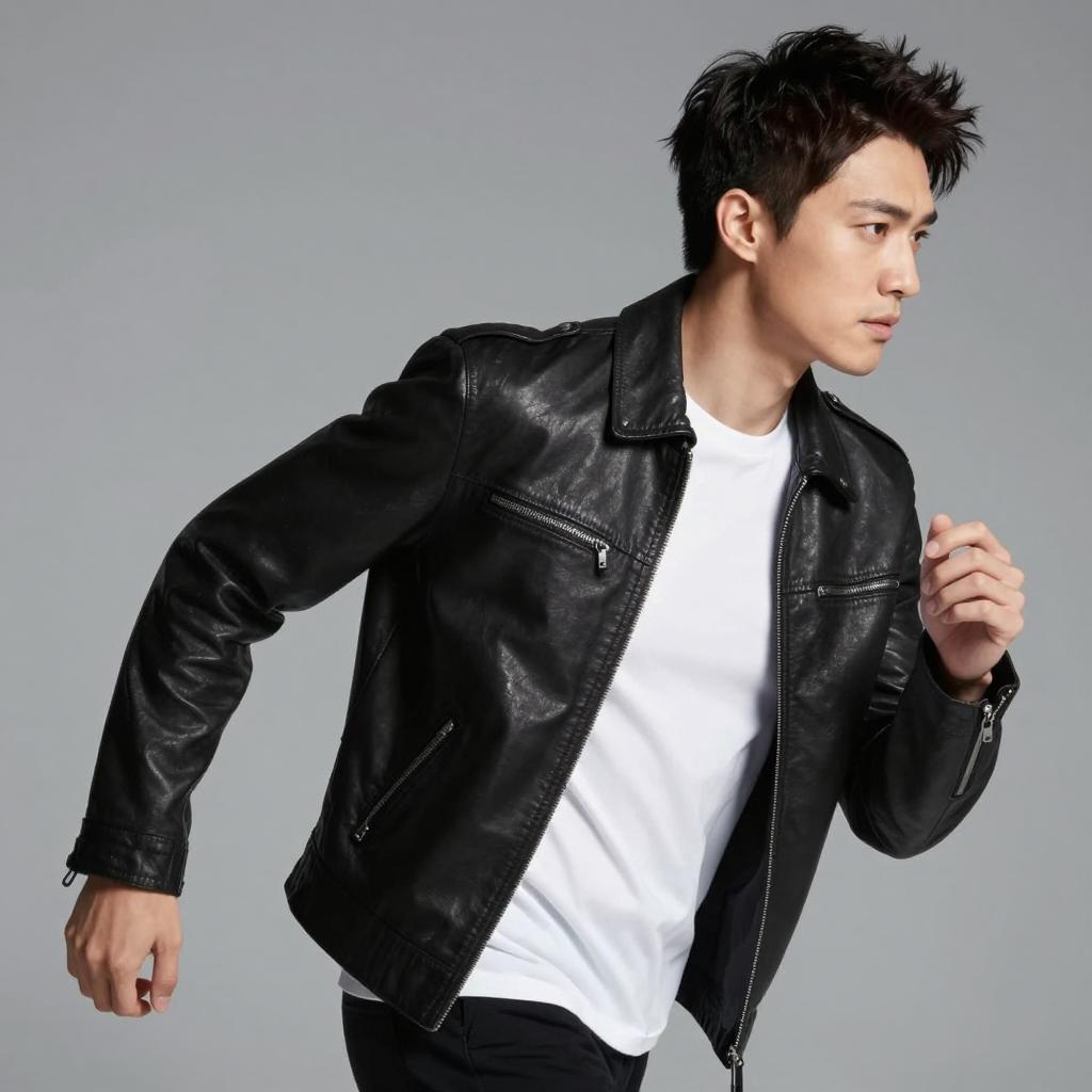 Man, casual, black leather jacket, white crew neck t-shirt, hair styled casually, running pose, solid grey background.