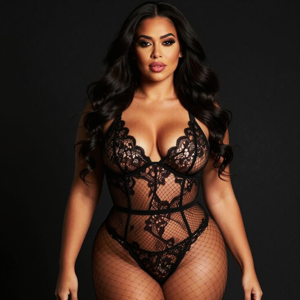 Photograph of a curvy woman with long, wavy black hair and tan skin wearing a sheer black lace bodysuit that reveals her large breasts and toned body. She has dark, smoky eye makeup and full lips. She's wearing a black choker and standing against a dark background with two vertical white lights on either side, creating a dramatic effect.