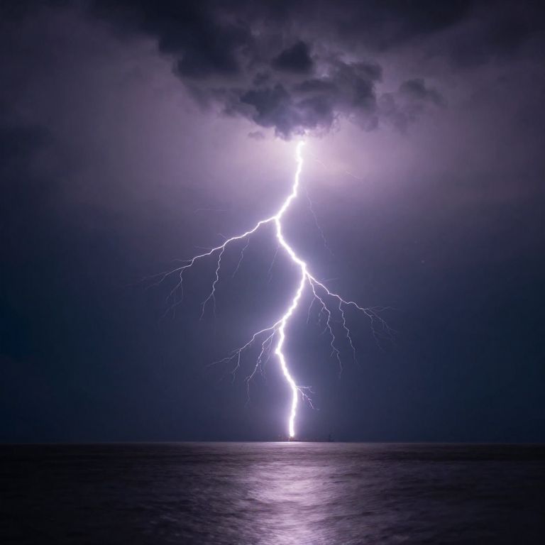 Nature's raw power and serene beauty converge in a fleeting moment, as a jagged bolt of lightning pierces the night sky, casting a ghostly glow over the calm waters and whispering the impermanence of life’s fleeting brilliance.