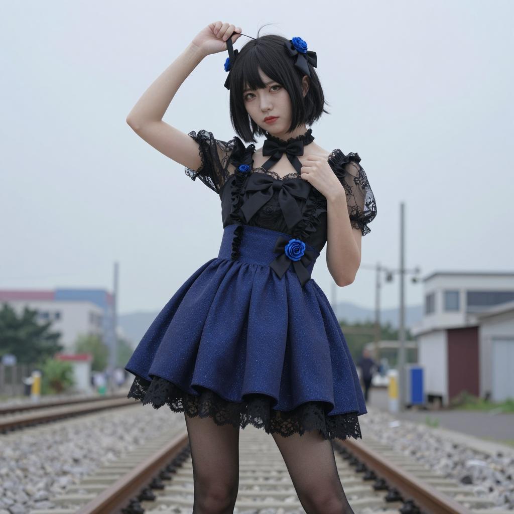Woman with short black hair wearing a black bow and black lace sleeve dress with blue flower accents. Black choker necklace, black hair bow, holding a black strap. Blue sparkly skirt, black stockings. Background: outdoor urban setting, overcast sky, railway tracks. Intense expression, pale skin. Standing with legs slightly apart, arm raised.