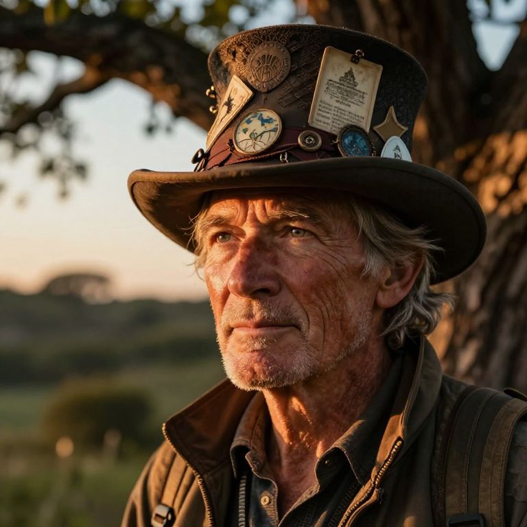 Render a hyperrealistic portrait of an experienced wanderer with sun-kissed features and a top hat adorned with mementos from distant lands. Set amidst an ancient tree at sunset, his eyes convey a lifetime of adventures. The soft golden light filters through the foliage, casting long shadows on his rugged face while illuminating the intricate details of his hat. This solitary yet wise figure evokes a profound connection with nature and self, as if one has stumbled upon a guardian of ancient secrets in this secluded woodland.