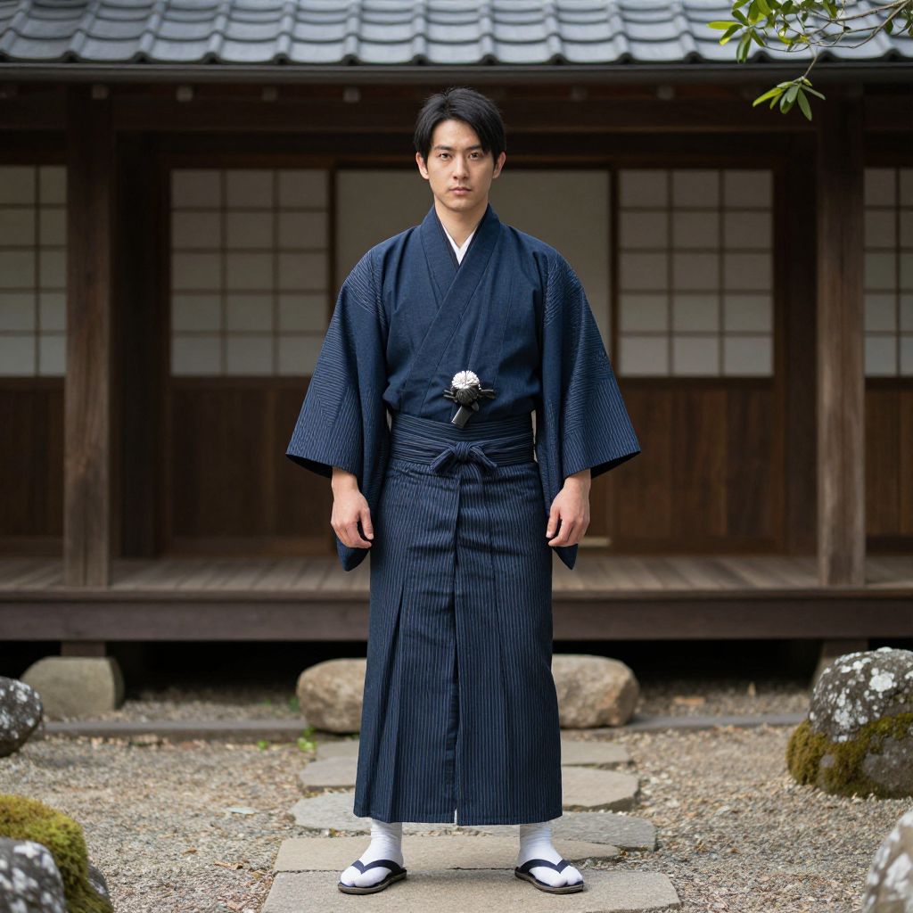 Photograph of an East Asian man in traditional navy blue yukata with white tabi socks, standing in a Japanese garden courtyard. Wooden building with sh