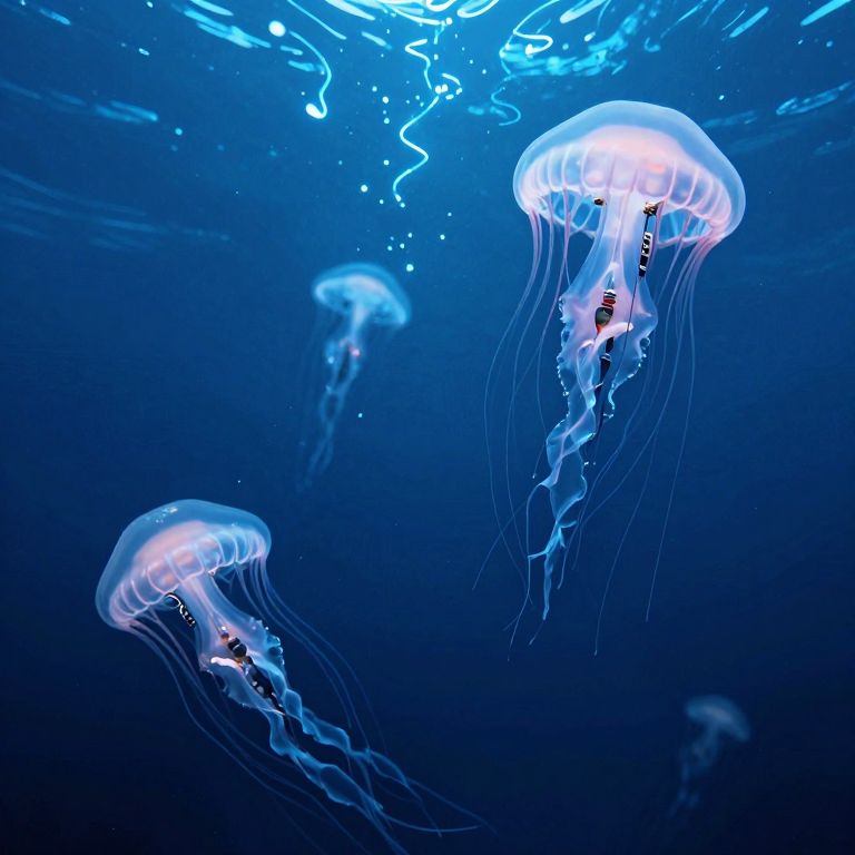 Jellyfish with mechanical brains float through an underground ocean, guiding lost thoughts to the surface via glowing trails.