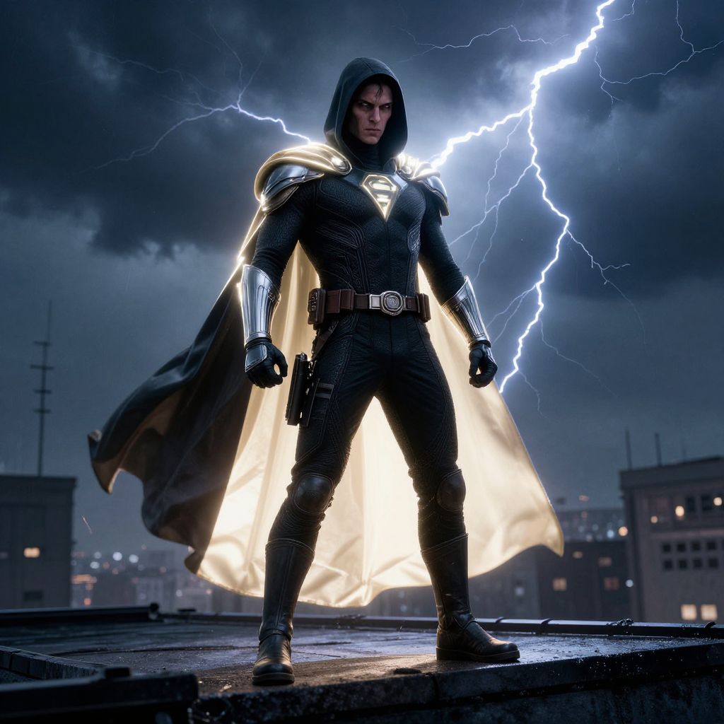 Cool superhero art depicting a mysterious figure with a glowing cape standing on a rooftop under a stormy sky, lightning bolts illuminating the intense expression, intricate costume design combining old-school and high-tech elements, cinematic lighting and shadows.
