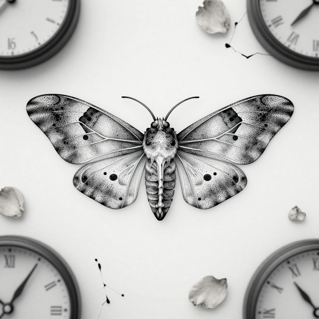 Elegant death hawk moth tattoo concept, symmetrical wings with bone-like veins, inked in fine lines and dotwork, blending nature and mortality symbolism, surrounded by cracked clocks and fading petals, minimalist dark art style with subtle gradients and high detail.