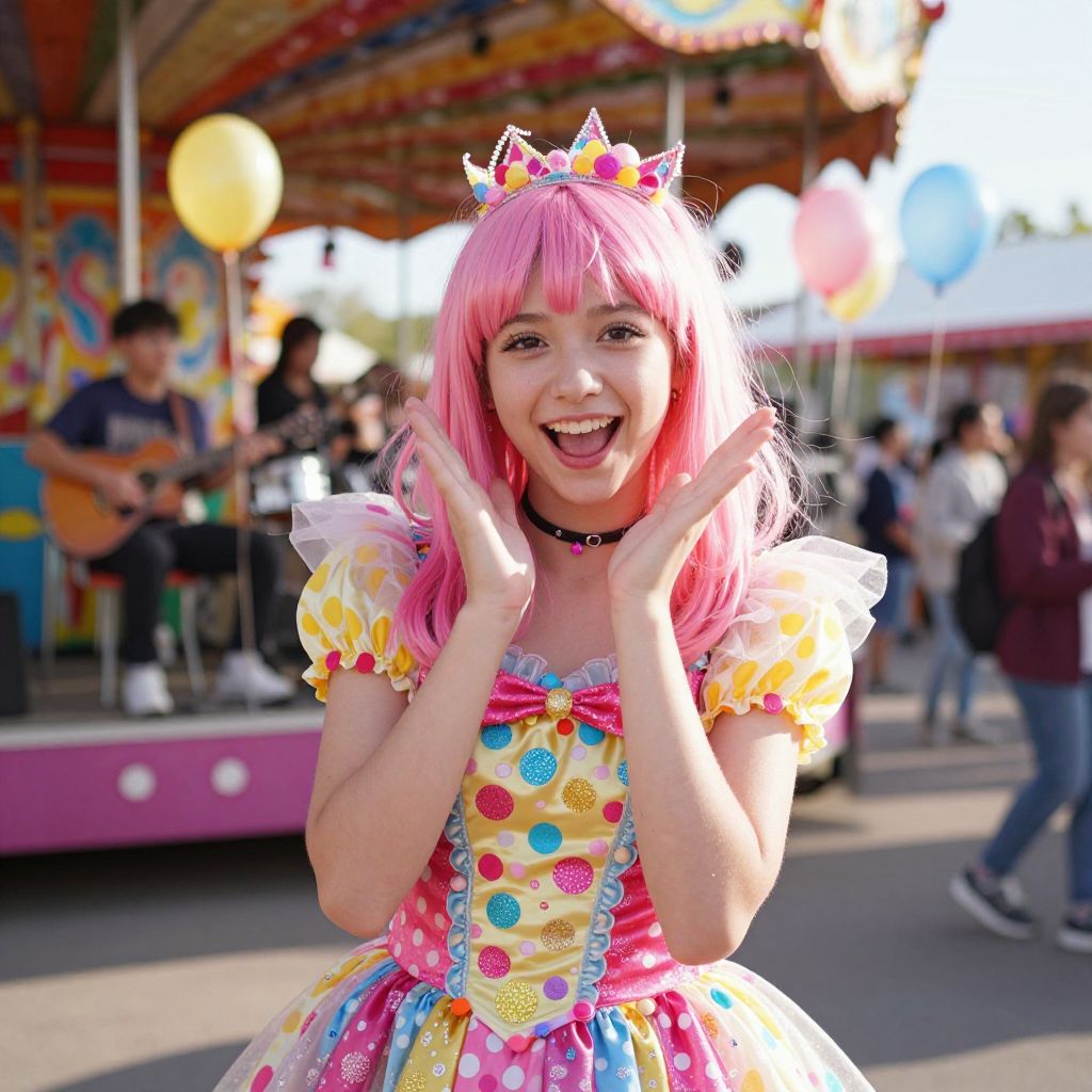A playful teen girl with bright pink hair styled in a layered crown hairstyle, wearing a festive costume with polka dots and glitter, standing at a carnival in a sunny afternoon with music playing and colorful balloons floating around, her face smiling widely and full of enthusiasm