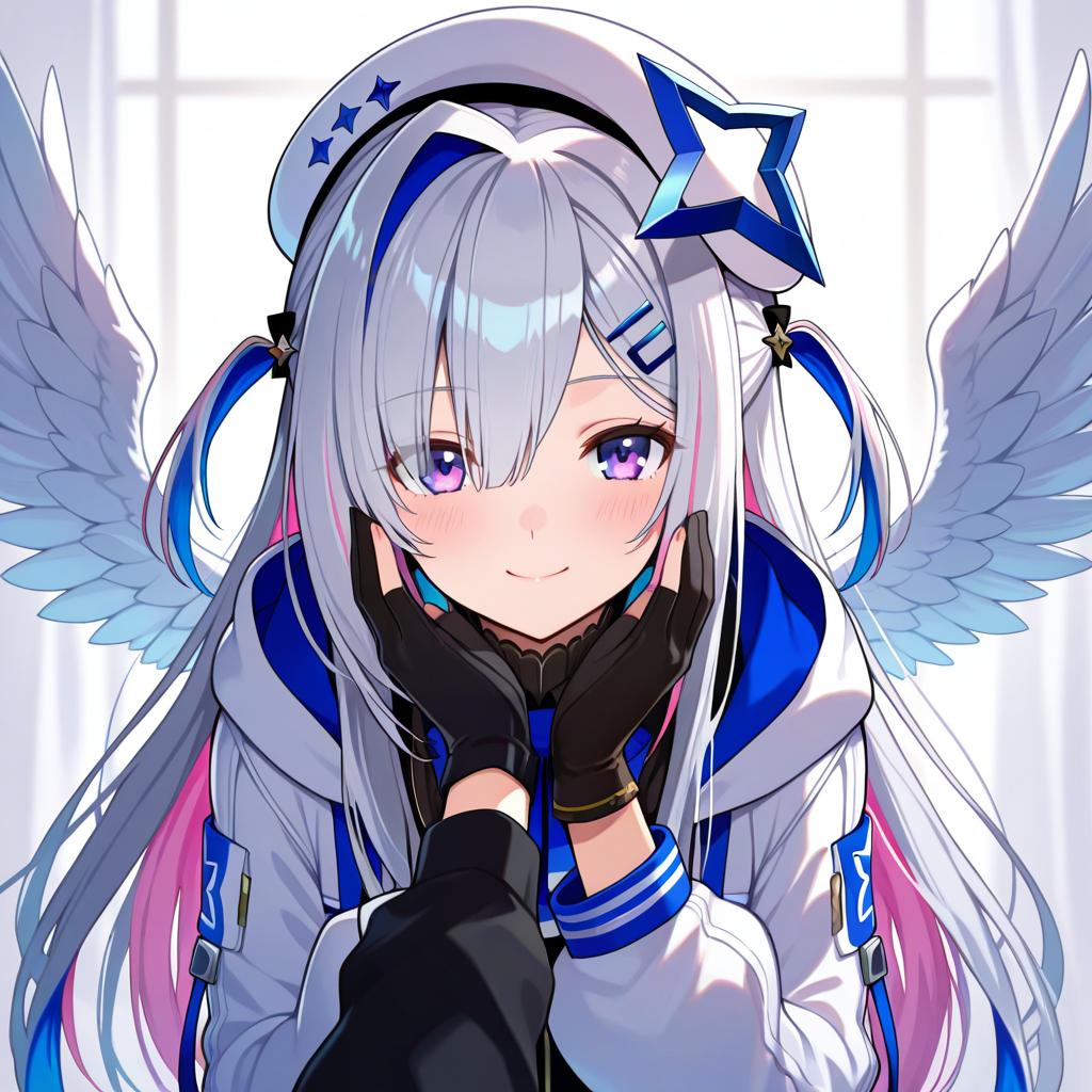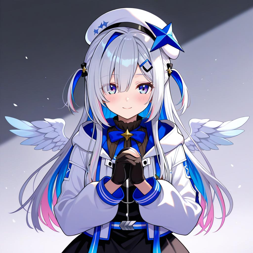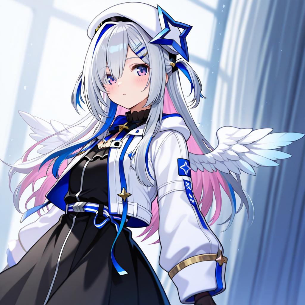 Amane kanata (work), hololive, 1girl, angel wings, angel, angel wings, purple eyes, hair over one eye, blue hair, grey hair, colored inner hair, single hair intake, official alternate hairstyle, long hair, official alternate hair length, streaked hair, pink hair, asymmetrical bangs, two side up, hairclip, black gloves, partially fingerless gloves, white jacket, black dress, white headwear, star halo, virtual youtuber, virtual youtuber, feathered wings, white wings, mini wings, feathered wings, white wings, mini wings, beret, by artist ruteko (ruko220), illustrious
