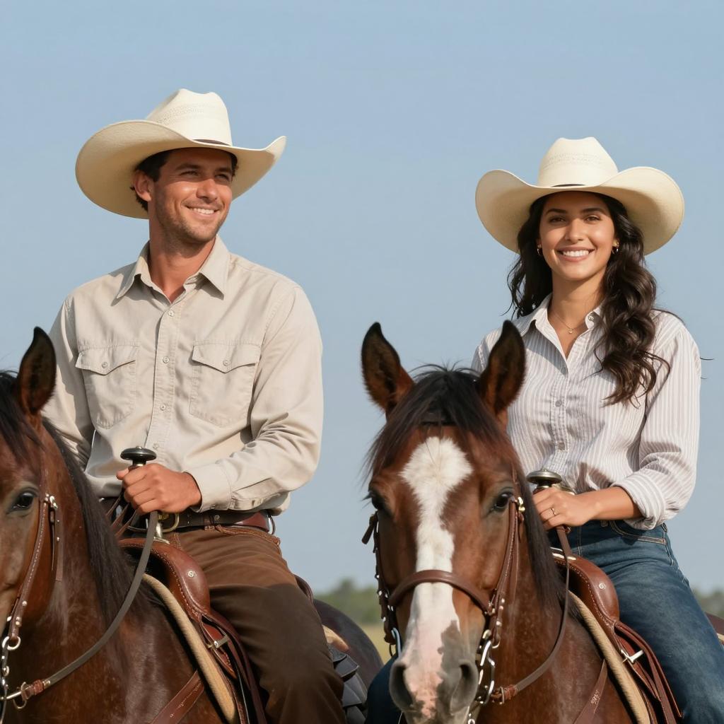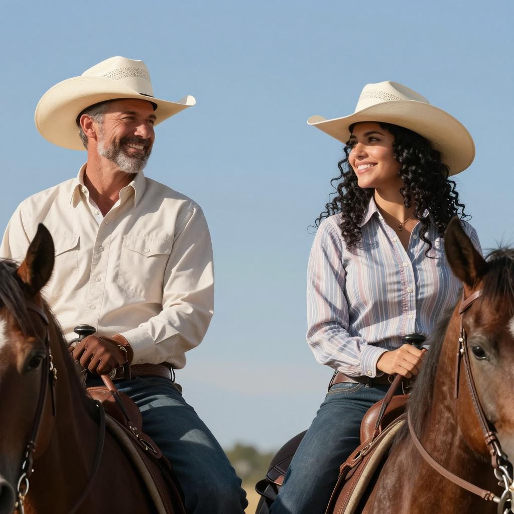 Two people riding horses. Man on left, middle-aged, bearded, wearing blue denim shirt, beige cowboy hat, smiling. Woman on right, young, wearing brown cowboy hat, pink scarf, patterned shirt, looking to the side. Background: blurred outdoor setting with fence.