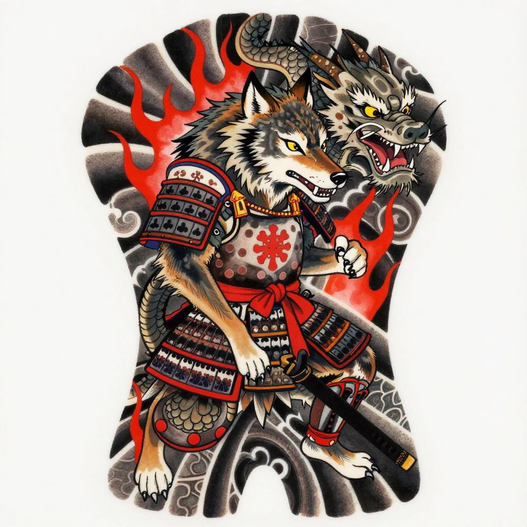 Wolf tattoo Japanese style inspired by samurai aesthetics, wolf wearing armor with Japanese crest motifs, surrounded by fierce dragons and stylized flames, intricate texture and contrast in black and grey with spots of crimson, richly detailed and dynamic pose