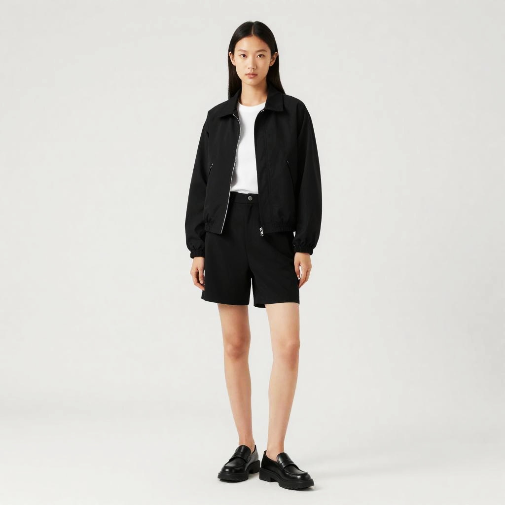 Modern Smart Casual Female Costume, woman in a black jacket and shorts posing for a picture
