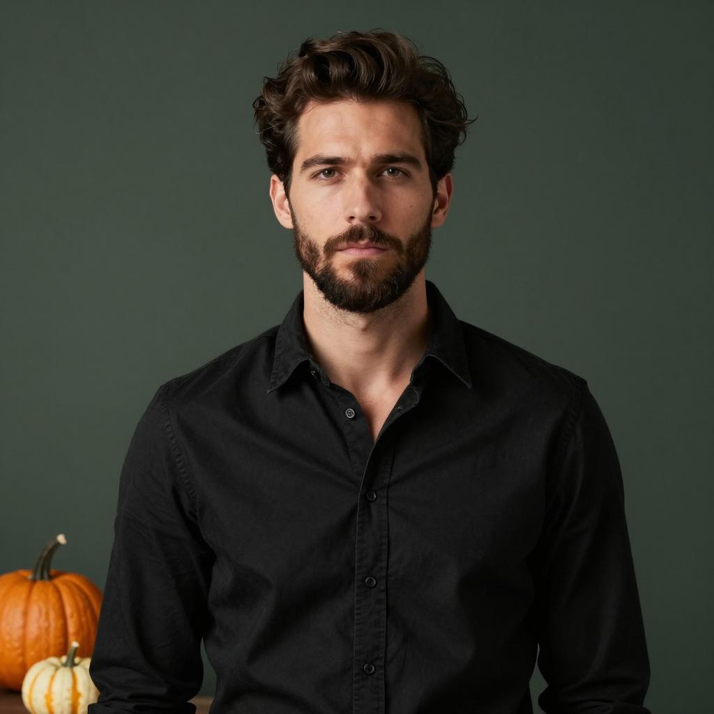 Halloween costume grown man, photorealistic portrait of a handsome man with dark brown hair and beard, wearing a black button-up shirt, neutral expression, dark green background, two small pumpkins in the lower left corner, professional studio lighting, mid-shot, front-facing, slightly blurred background, realistic ures, detailed clothing, subtle shadowing