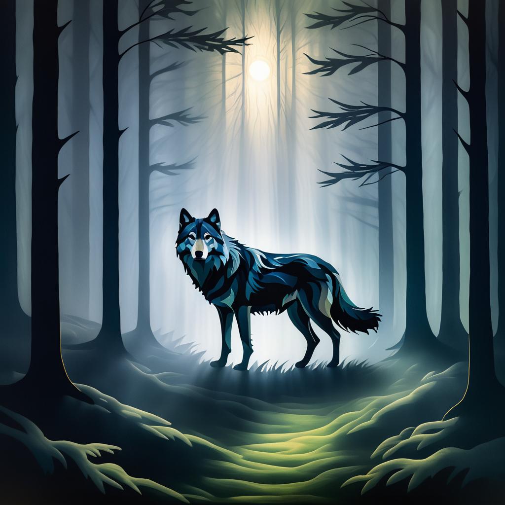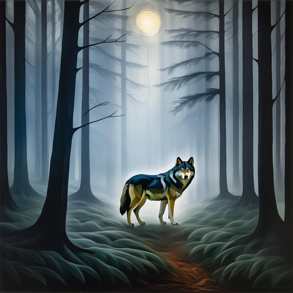 Painting by Edvard Munch of a mysterious wolf in a foggy forest, rendered in Renaissance-style lighting with high detail.