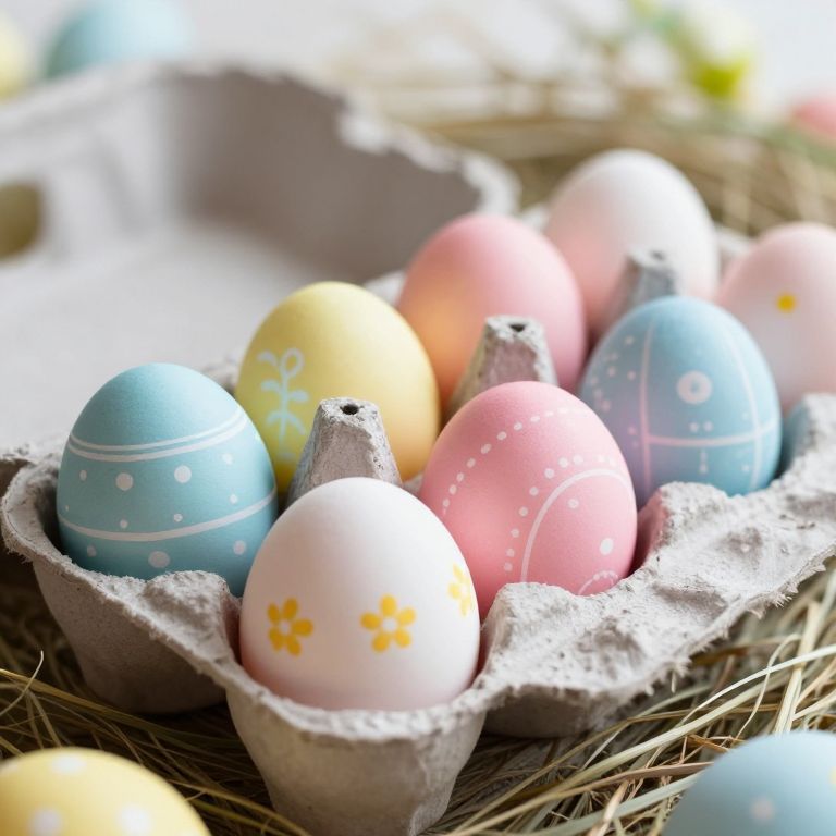 Close-up of eggcart holding colorful painted Easter eggs, with intricate patterns, placed on soft hay in a cozy spring setting, soft pastel colors, delicate shadows, high resolution artistic style