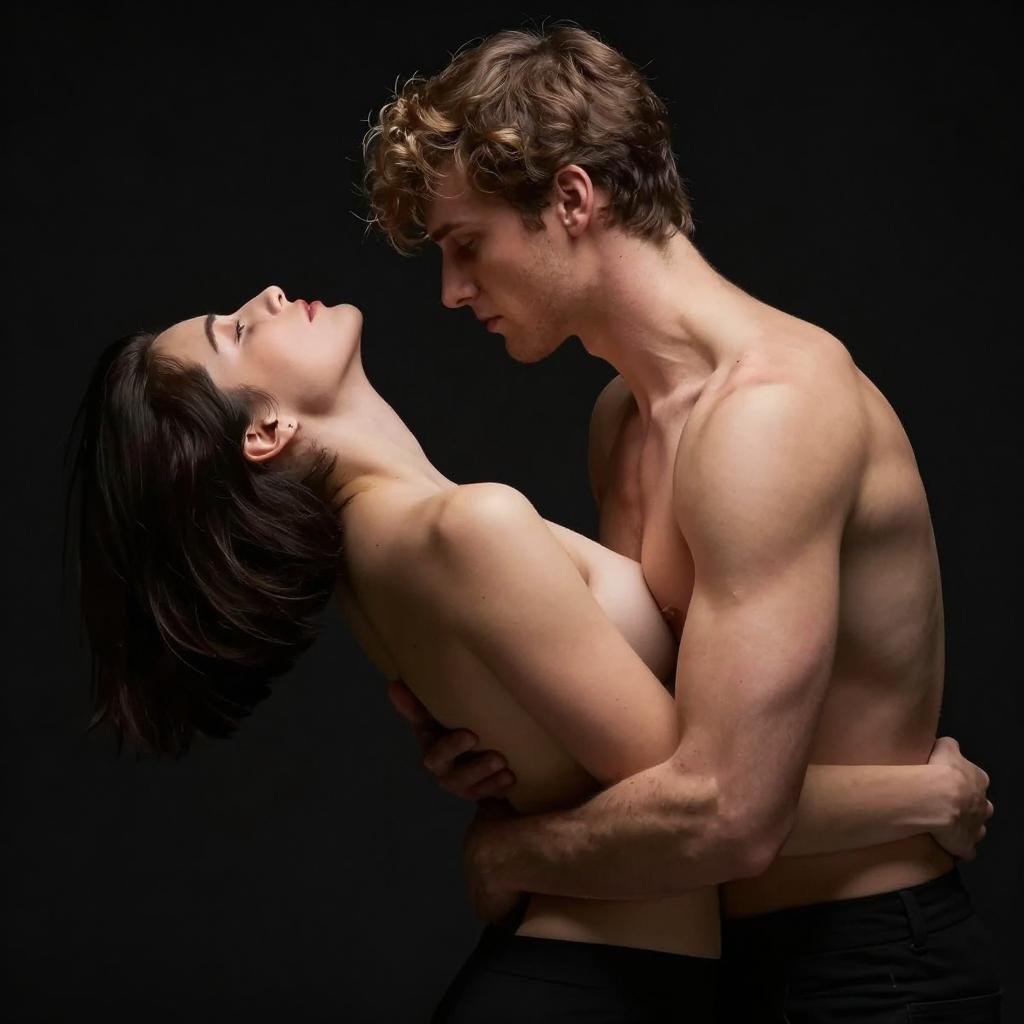 A couple dancing, backlit. Woman with curly brown hair, black dress, black high heels. Man with long brown hair, beige jacket, black pants. She leans back into him, his hands on her hips, hers on his. Vertical black shadow in center. Intense, defined expressions. High contrast lighting.