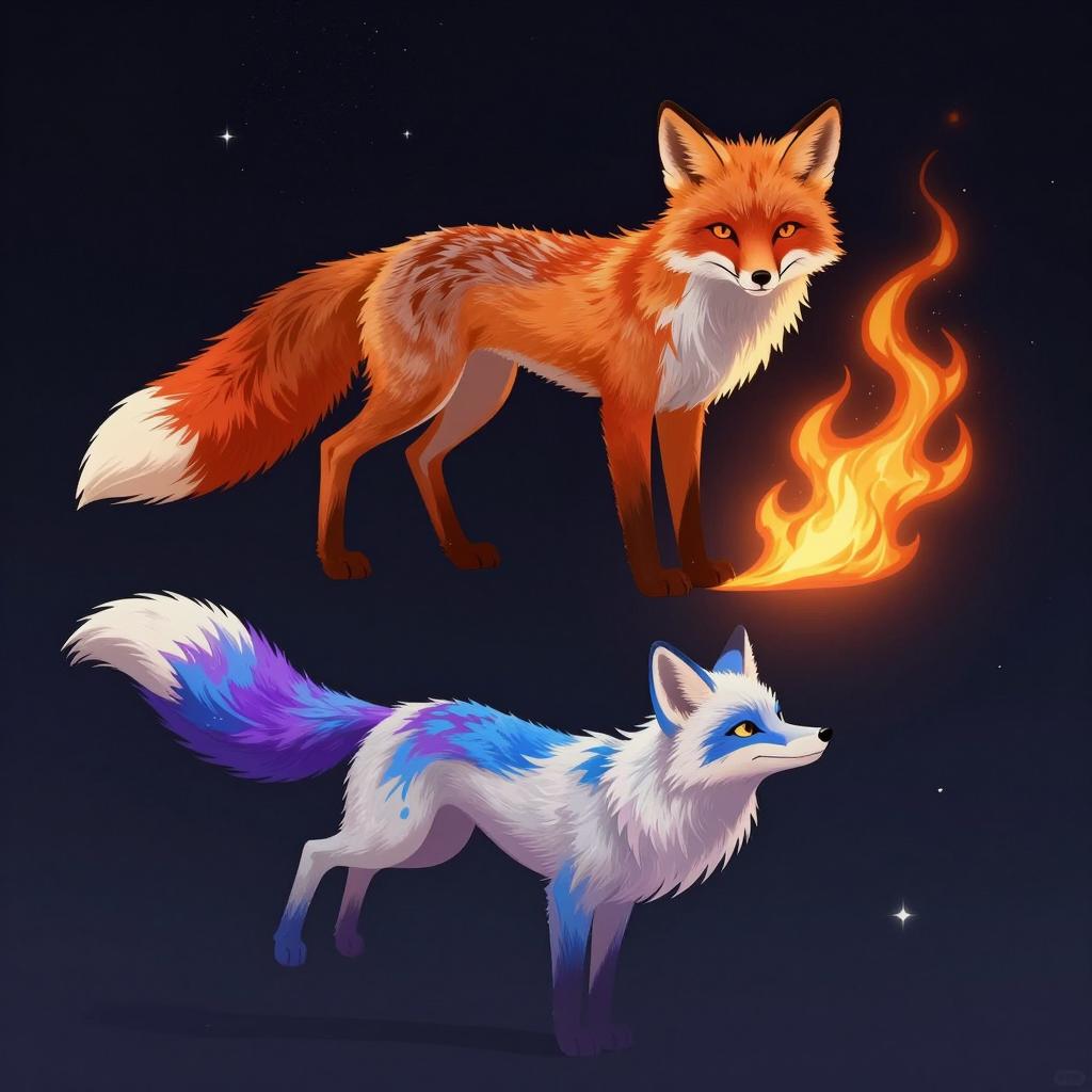 Digital illustration of two foxes. Top fox with fiery orange and red fur, standing, facing forward, flames in its tail. Bottom fox with white, blue, and purple fur, floating, looking up. Dark background above, starry space below. Artist "tamsella" and "deviantart" on edges.