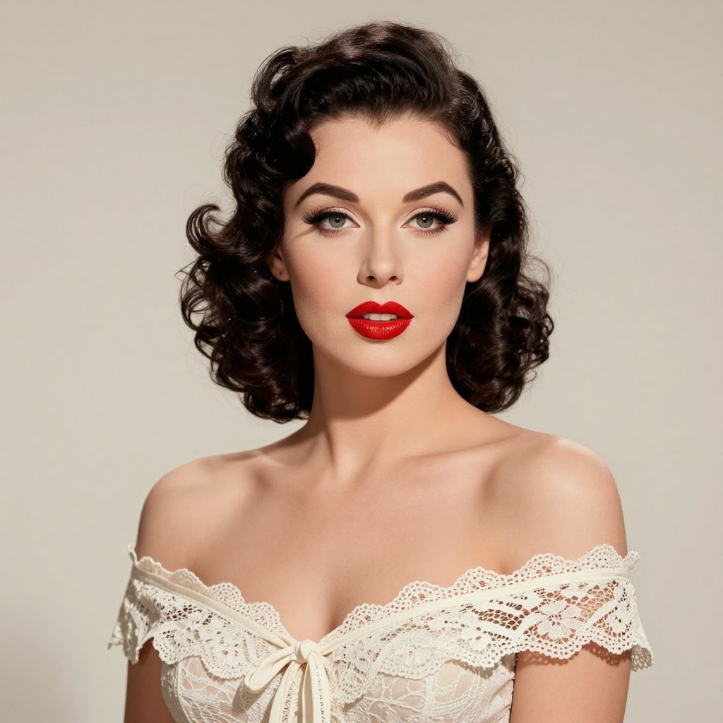 A high-definition digital illustration captures a vintage 1950s Hollywood glamour look, featuring a woman with meticulously styled dark curls, bold red lipstick, and a lace-trimmed off-the-shoulder top, embodying classic retro beauty and elegance.