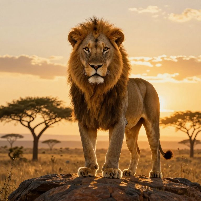 Photograph of a majestic male lion standing on a rock during a golden sunset in the African savannah, with acacia trees in the background.