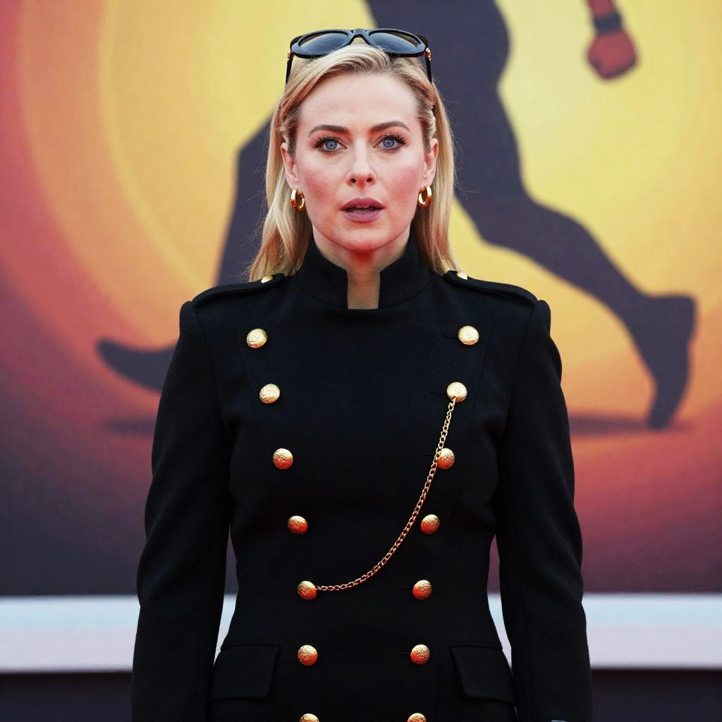 Photograph of a blonde woman with blue eyes, wearing a black military-style coat with gold buttons and chains, gold earrings, and sunglasses on her head. She has a surprised expression. In the background, a colorful poster with a person running. The woman is centered, poster is on the right.