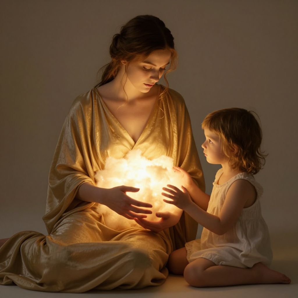 Radiant light illuminates a serene scene where a woman draped in a golden-hued robe cradles a glowing bundle of soft, fluffy material, while a child sits beside her, both bathed in warm, ethereal illumination.