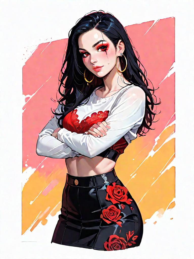 1girl, source_comics, realistic face, full body shot, Woman, bold, body-hugging two-piece set in red lace print, square neckline, long sleeves, cropped top with midriff cut-out, matching mini skirt, high-waisted, hoop earrings, minimal makeup, plain white studio background